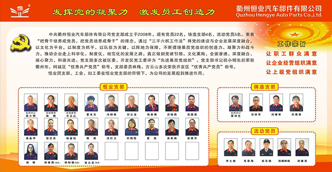 中共衢州恒业汽车部件有限公司党支部成立于2008年,现有党员22名,铸造支部4名,流动党员5名。秉着“把骨干培养成党员,把党员培养成骨干”的理念,通过“三手六爪工作法”将党的建设与企业发展深度融合,以文化为平台,以制度为抓手,以队伍为关键,以阵地为保障,不断提增基层党组织的创造力、凝聚力和战斗力,推动企业走上科学化、制度化、规范化的发展之路,真正做到党建引领、文化熏陶、全面渗透、深度融合、凝心聚力、和谐共进。党支部多次被区委、开发区党工委评为“先进基层党组织”。党支部书记祝小明先后荣获衢州市、柯城区“优秀共产党员”称号,支部委员林梅、方云山多次荣获开发区“优秀共产党员”称号。